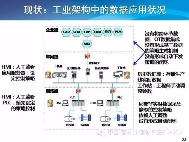 目前工业架构中的数据应用总体来看是相对割裂的,没有完全形成一个闭环。企业有一个网关,这是防火墙,生产环节的数据基本上还是在这个层面,没有很好的和企业之间衔接起来。很多数据的配置和使用都依赖于员工的调整,没有达到智能化自动的调整。另外,没有形成真正的闭环,以及和企业层面形成大的闭环。