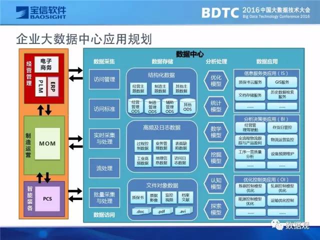 下面介绍工业大数据。工业大数据在很核心的位置,包含很多环节,包括采集、处理、建模、决策。数据源很多,来自不同的元素,包括传感器、机器、工厂、企业经营数据。通过网络互相衔接形成大的闭环。