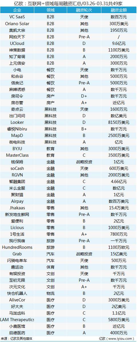 为方便大家了解、回顾每周的创投市场,亿欧整理出过去一周内(0326-03.31)共49家创业企业投融资事件,涉及到的领域有:金融(7家)、医疗(6家)、黑科技(6家)、零售(5家)、汽车2家、教育(2家)、房产(2家)、餐饮(4家)、文创(3家)、B2B(8家)、旅游(2家),体育(1家)、物流(1家)。