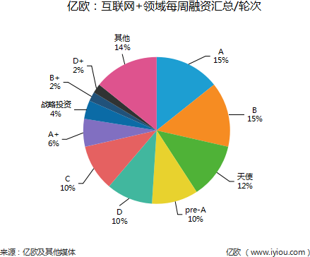 从融资轮次看,A轮、B轮并驾齐驱,天使轮,Pre-A轮、C轮、D轮三者紧随其后,融资项目分部较为均匀。这和上周的Pre-A轮和A+轮双寡头的格局有很大不同。