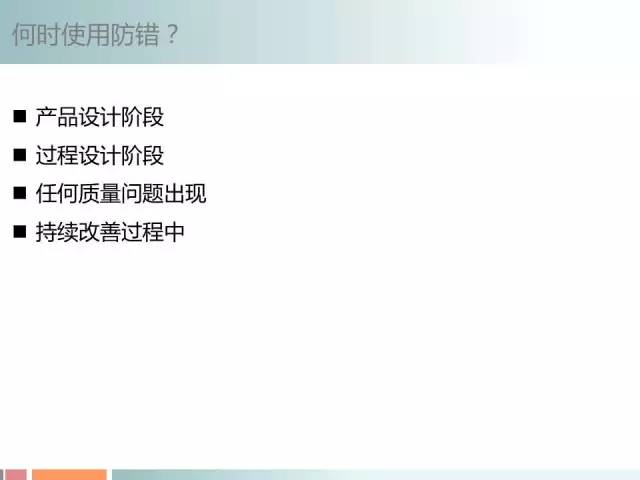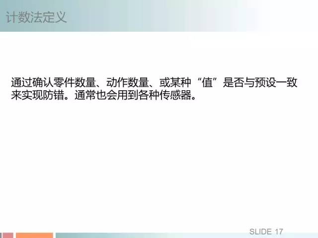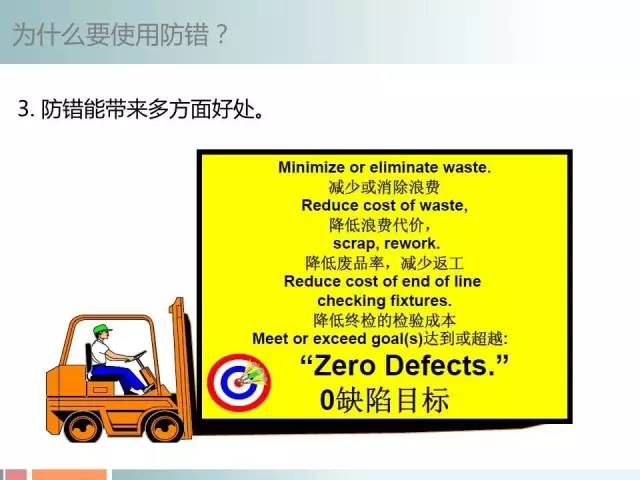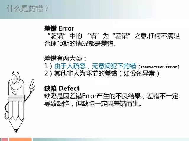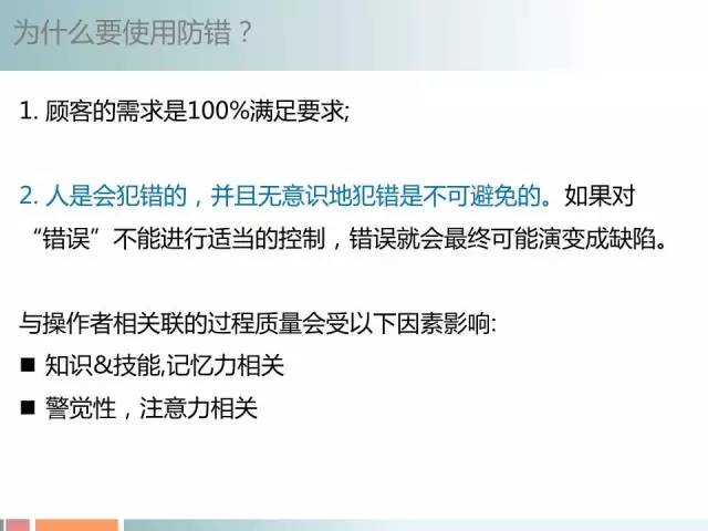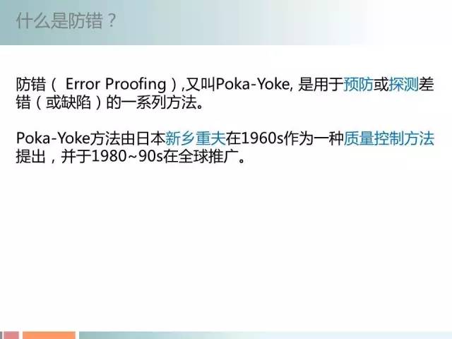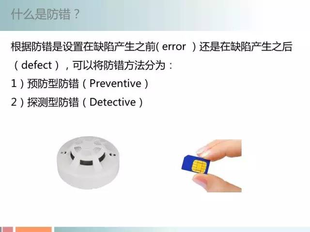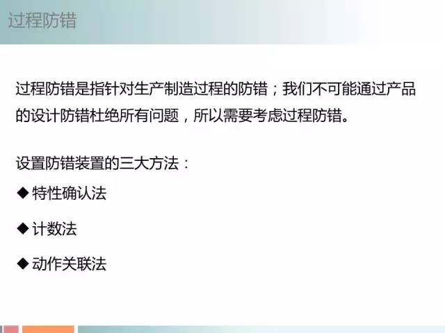防错原理是通过究源性检查找出产生缺陷的根本原因,设计装置或方法对此差错实现100%检验,避免缺陷再次出现的方法。