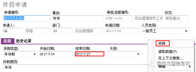 正确操作:员工请假回厂后,联系考勤员销假,考勤员可根据员工实际回厂时间,修改结束日期,确认休假天数,之后,右键点击“核销”,闭环休假申请流程。