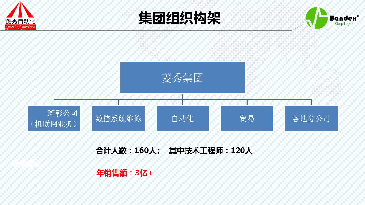 菱秀集团分为几个大块:第一是机联网业务,就是斑彰公司,第二是数控系统维修,第三是自动化,第四是贸易、然后是其它的贸易分公司。公司合计160人,工程师120人,我们是技术公司,公司年销售额3亿多。