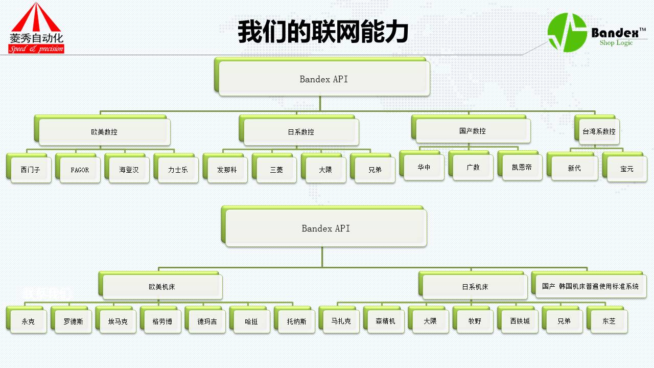 现在接着说一下我们机联网业务,机联网业务基于前面的菱秀集团20多年数控的经验。我们机联网的能力表现在哪些方面,可以从几个维度说一下:首先从数控系统的品牌,数控有几个大类,欧美、日系、台湾,国产、定制机系列。这主流四大系列会存在很多的差异,有的是开放的,有的半开放的,有的完全封闭的,很多,搞数控系统的人都会知道。另外一个从机床角度来分,分为欧美、日系、韩系、中国机床,我们都是OK的。第三个角度从设备的类型来说,PLC还有机械手系统还有放电机系统都没有问题。第四个角度是从机床的类型来说,从冲床、激光切割机、注塑机,测量仪器,AGV小车以及锻压机都可以采集。