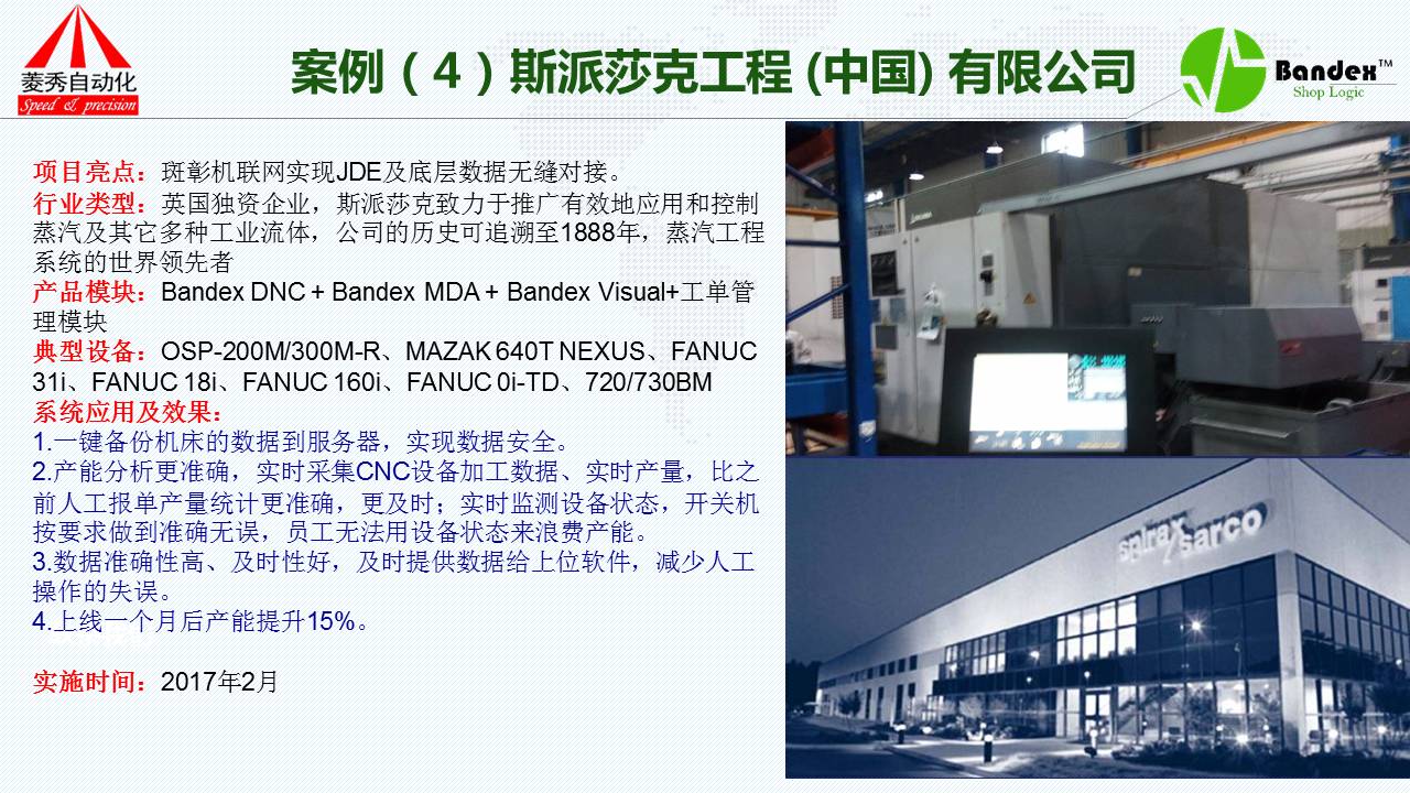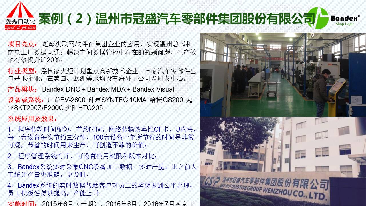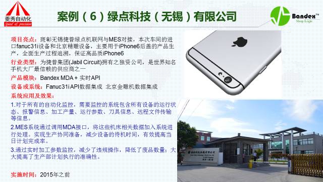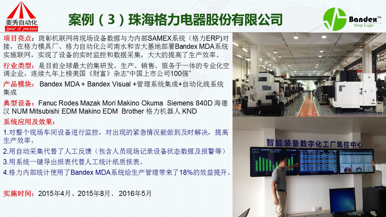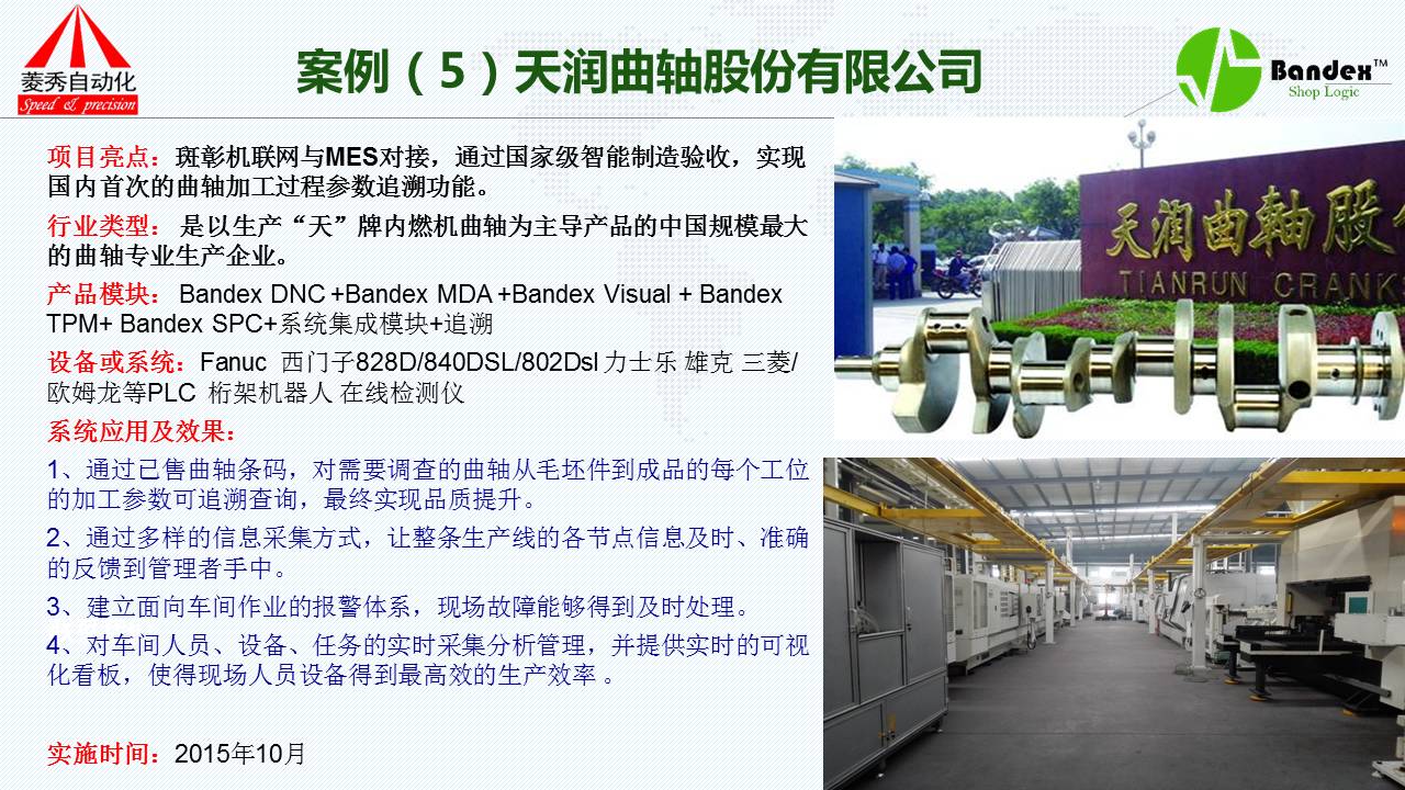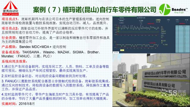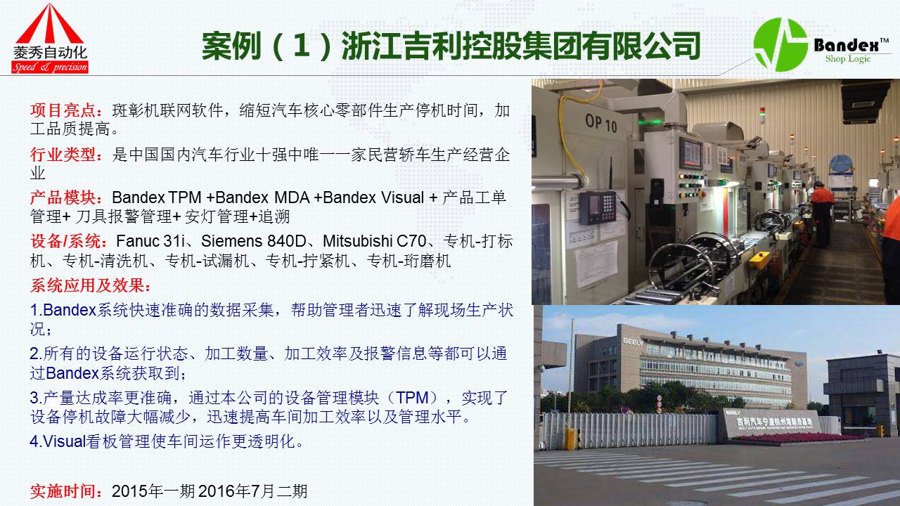 第一个案例是完全没有使用MES系统的客户,完全使用我们的机联网系统。吉利汽车,客户不介绍,我只说它的使用效果:采用了我们的系统之后,它能够快速准确的采集到各组生产线的数据,帮助管理者迅速地了解生产线的现实状况;第二采集到的数据,包括设备的运行状态、加工数量、FS等加工的效率以及信息都可以通过斑彰系统获得;第三产量达成率更加精准,通过TPM管理实现了停机设备中故障率大大降低,故障处理的时间大大减少,迅速提高了加工效率及管理水平;第四通过我们的看板系统,老板或者车间负责人完全可以在办公室监控到每一条生产线、机器、工单、操作人员的状况,包括机器的任何一点微小的变化都能察觉到。