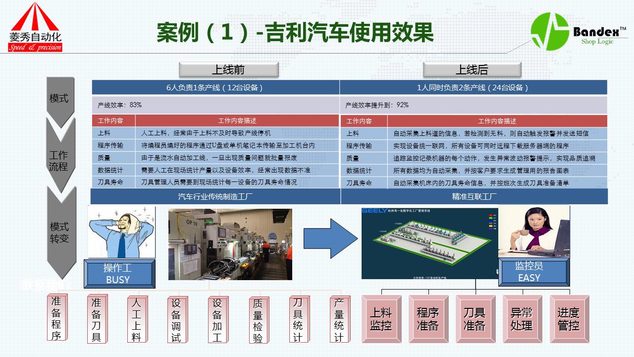 再来看上线前、后根本性的变化,首先看模式,吉利汽车上线之前6个人负责一条生产线,一条生产线12条机器,产线效率83%,上线以后一个人同时负责两条生产线,一个人看24条机器,生产效率达到92%。
