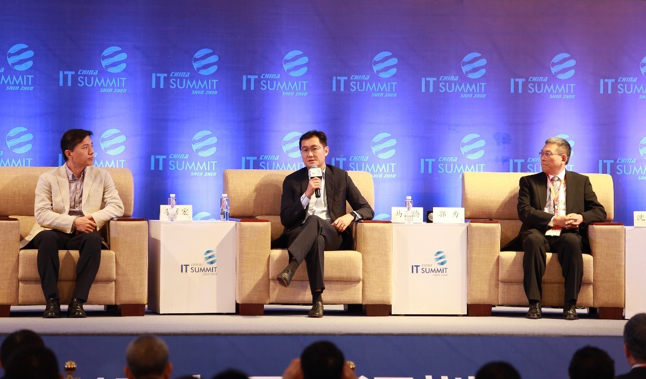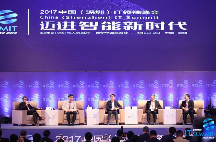 在2017中国(深圳)IT领袖峰会期间,腾讯董事会主席兼首席执行官马化腾,百度董事长兼首席执行官李彦宏,神州数码控股有限公司董事局主席郭为,微软公司全球执行副总裁沈向洋围绕“人工智能:中国基于与挑战”这一主题展开对话。