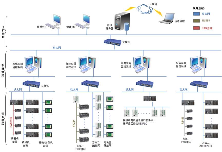 1)纺织现有生产管理流程及产线布置,台达纺织MES系统基于分工厂级层、车间级层、设备级层共3层个层面。设备层与车间层可以根据现场备用接口及成本考虑灵活选用通讯总线RS485/CAN/DEVICENET/ETHERNE;