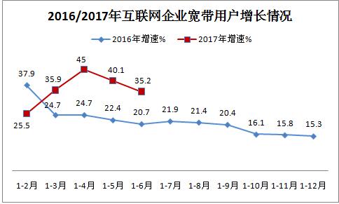 在宽带中国战略和宽带接入市场开放试点等政策的推进下,民营资本持续进入宽带接入市场扩大投资,用户数量稳步增长。截至6月末,互联网企业共发展宽带接入用户3752万户,同比增长35.2%。