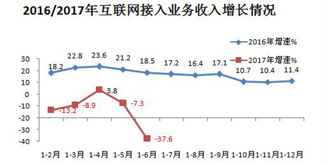 1-6月,互联网企业完成互联网接入业务收入77.3亿元,同比下降37.6%。