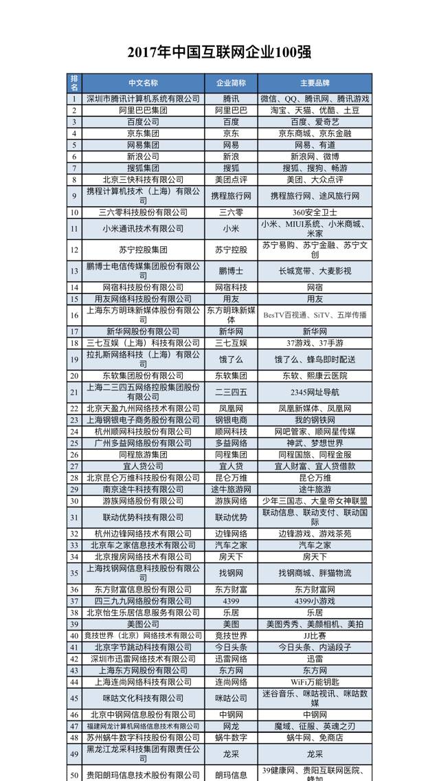 近日,中国互联网协会、工业和信息化部信息中心在京联合发布2017年“中国互联网企业100强”榜单。本次百强榜单的前十名为:腾讯、阿里巴巴、百度、京东、网易、新浪、搜狐、美团点评、携程、360。其中,腾讯、阿里巴巴、百度连续五年位居前三。