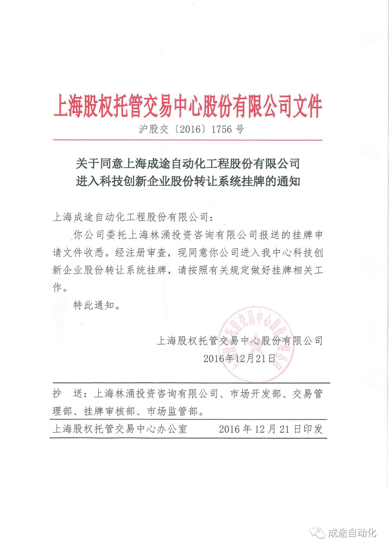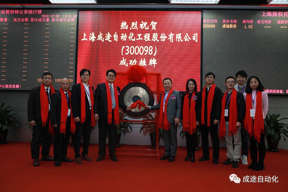 2016年12月30日,上海成途自动化工程股份有限公司正式挂牌上海股权托管交易中心科技创新板N板(股份简称:成途股份;股份代码:300098)。