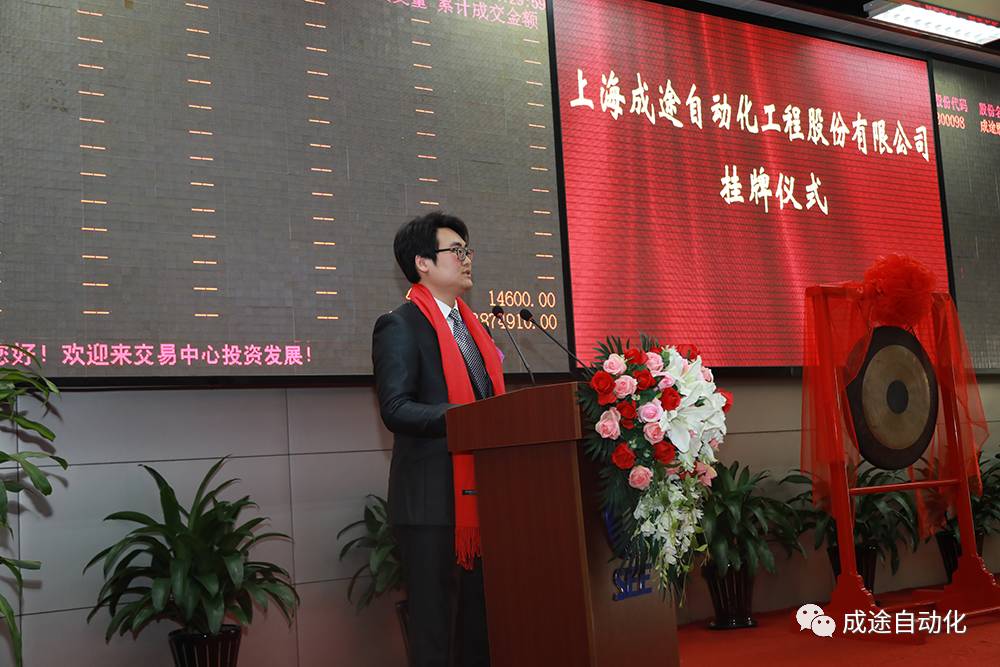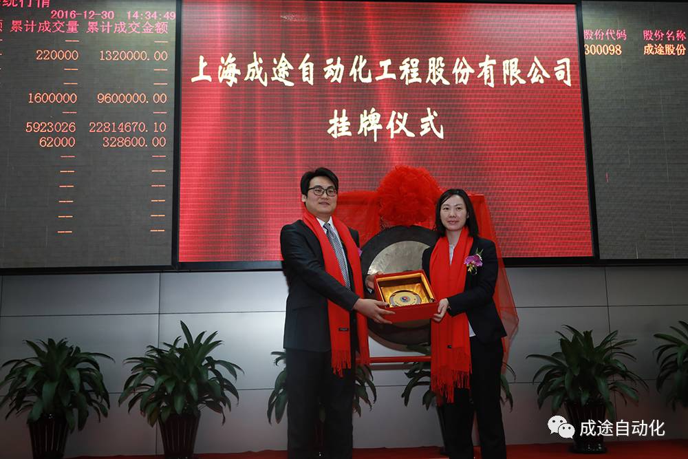 2016年12月30日,伴随着上海股权托管交易中心敲响的铜锣声,上海成途自动化工程股份有限公司在上海股权托管交易中心的科技创新板(N板)成功挂牌(股份代码:300098),成途自动化由此开启企业发展新阶段。共青团上海市委兼职副书记、沪江网联合创始人于杰先生,上海奉贤投资(集团)有限公司董事长褚建平先生,奉贤区金汇镇经济镇长张贤女士,奉贤区金融办副主任李晶先生,共青团奉贤区委副书记翁晔先生,浦东新区高桥镇党委委员、副镇长嵇晨清先生等相关领导出席挂牌仪式。