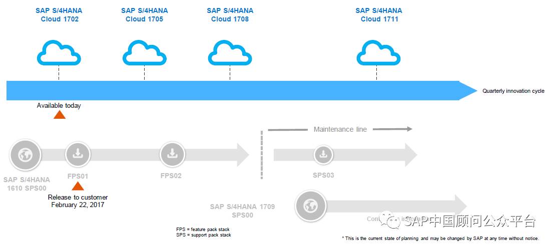 图蓝线上端是SAP S/4HANA云产品,可以看出SAP是按季发布其云端产品的;
