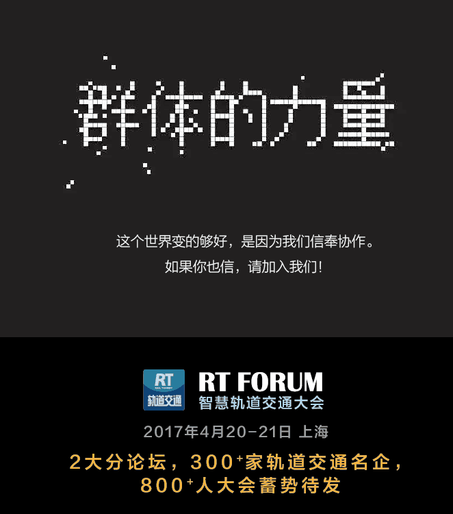 4月20日-21日于上海举办的“RT FORUM智慧轨道交通大会 ”,将重点讨论运维智能化与健康管理以及轨道交通通信系统互联互通、智能化与智慧化发展、LTE综合承载以及信息安全等相关话题。本次活动由国家发展和改革委员会综合运输研究所、“十三五”国家重点研发计划《先进轨道交通重点专项》总体专家组、中国中车研究院等单位指导,由上海地铁维护保障有限公司、轨道交通控制与安全国家重点实验室、高速列车集成国家工程实验室、国家轨道客车工程研究中心工程实验室等协办、RT轨道交通承办。 (点击左下角“阅读原文”快速报名!)