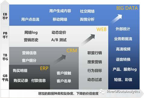 (上图最早是在Teradata看到的,我没有追踪过最初产地。该图强调的是:随着数据种类增加,数据量级和复杂度增加,但同时也伴随价值密度的下降。)