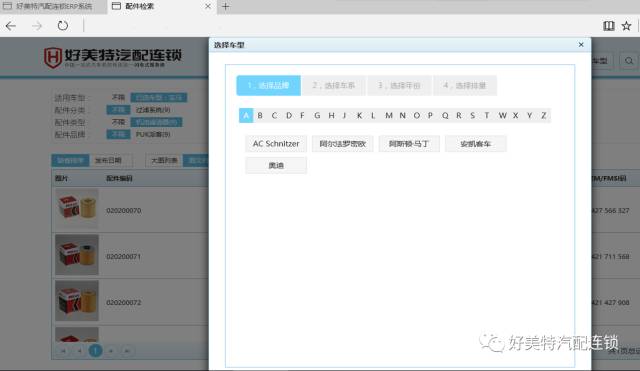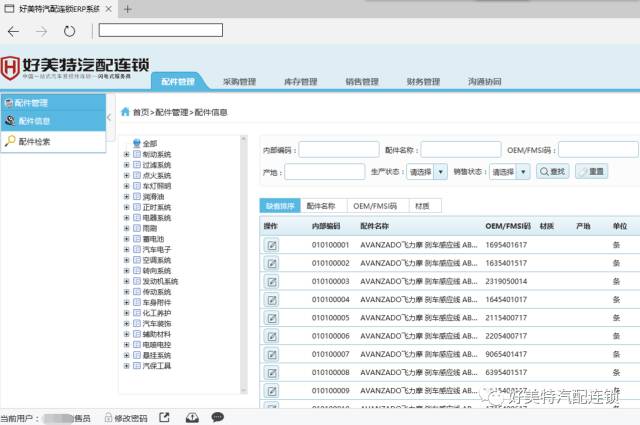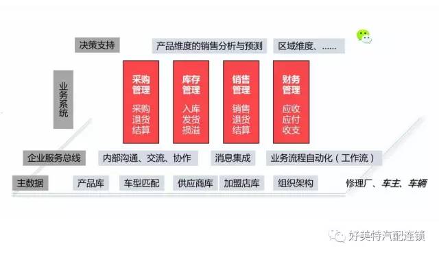 在好美特汽配的数据化、平台化战略布局中,包括ERP、微信商城,以及物流管理体系等;微信商城与ERP是一体化的,是前端与后台的关系,提供修理厂客户实现:技术参数查询、价格查询、车型匹配、图片查询。