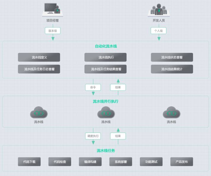 可实现单模块或者单独子系统的个人级交付,也可实现多模块、多子系统的版本级交付可随时查看流水线执行进度/结果/报告/日志。