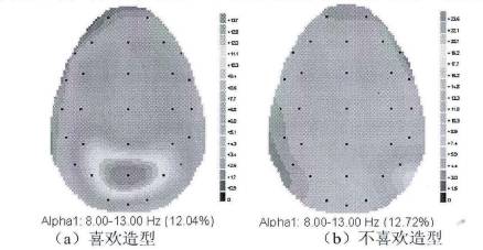 α波频率为8~13HZ,是成人脑电信号中的基本节律,在大脑各区均可采集到,顶枕部信号最为明显,波功率越大代表脑活动性越小;喜欢造型刺激下α波能量均显著大于不喜欢造型,即喜欢造型大于不喜欢造型。因此推断喜欢造型下脑活跃性高于不喜欢造型[4]。