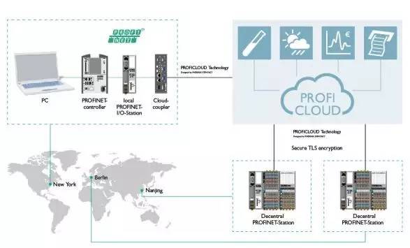 菲尼克斯电气提供的ProfiCloud技术可以让PROFINET的用户在不添加任何硬件成本的情况下,轻松实现安全、快捷的底层设备间的互联互通。在上图中,分布在不同地方的标准PROFINET设备,可以通过互联网连接到ProfiCloud云服务器上,并与之进行数据通讯。而本地的PROFINET系统可以通过云耦合器(Cloud Coupler)访问这些数据,对于本地的PROFINET控制器和编程人员来说,远程的设备就像直接连接到了本地PROFINET网络中一样,使用和编程都没有区别。在ProfiCloud技术中,远程的PROFINET子站甚至都不需要控制器,所有的控制命令都可以由本地PROFINET控制器发出,这样为客户节约了大量硬件成本。