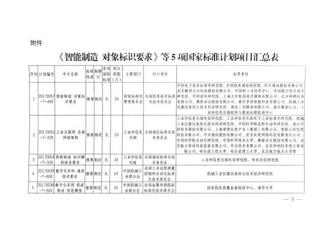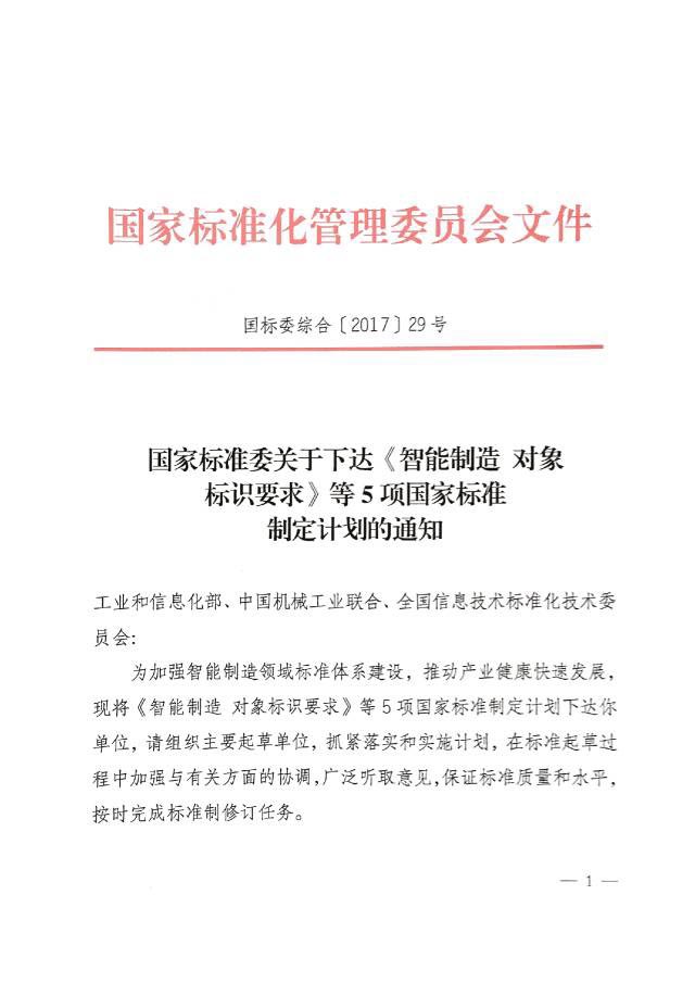 2017年3月23日,国家标准委发布《关于下达〈智能制造 对象标识要求〉等国家标准制定计划的通知》。至此,《智能制造 对象标识要求》等7项智能制造国家标准正式立项,该批标准是我国第一批智能制造国家标准,包含2项基础共性标准、4项关键技术标准以及1项重点行业标准。具体标准立项清单如下: