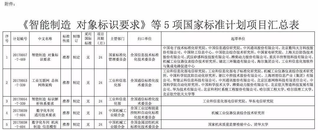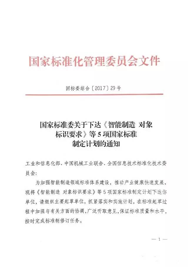 2017年3月23日,国家标准化管理委员会发布《国家标准委关于下达〈智能制造 对象标识要求〉等5项国家标准制定计划的通知》(国标委综合﹝2017﹞29号), “工业互联网 总体网络架构”与“智能制造 标识解析体系要求”2项国家标准正式获批立项。