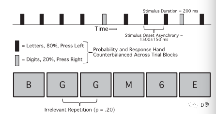 如上图所示,字母和数字在注意点的位置呈现,呈现时间为200ms,SOA为1500正负150ms。其中一种刺激类别出现较少(20%),另一类别出现较多(80%),被试对不同类型的刺激用左手或者右手进行按键反应。频繁或较少的类别的刺激和反应手都做了平衡。在频繁出现的字母或者数字中,偶尔会出现连续重复,比如图中的字母G。实验的目的是分析被试能否检测到这些重复,即重复与不重复是否存在不同的加工。与之前的研究结果相类似,低频刺激比高频刺激诱发了更大的N2和P3。更重要的是,重复比非重复诱发了更大的P1,特别是在右半球。另外,重复比非重复在中央和顶部电极点诱发更大的P2。因此P1和P2的结果表明在高频刺激系列中的重复刺激可以被检测到,即便它们与任务无关。而且这个结果表明,对重复的检测发生得很早(100ms左右),并且会影响后面的加工(P2)。结果如下图。