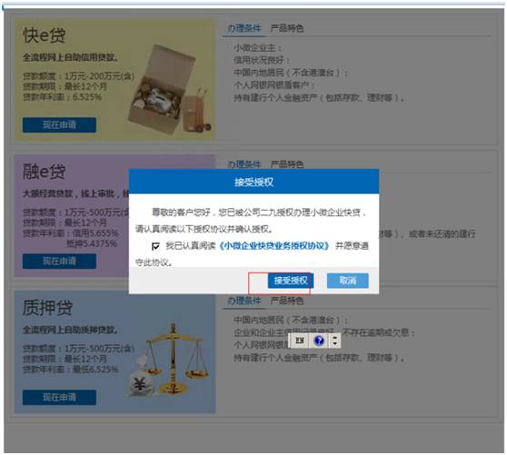 核对返显信息后,勾选《小微快贷业务授权协议》和《企业征信授权书》,可点击进行协议的查看并同意。点击“确定”进行授权。提示授权结果。