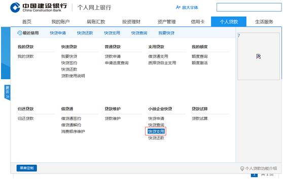 进入个人网银后,将鼠标移至“个人贷款”,系统显示目录菜单,点击菜单上的“快贷支用”进入小微快贷支用页面。