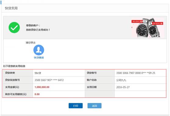 界面上反显放款信息。输入支用金额(贷款支用至企业账号)