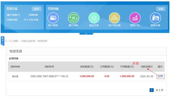 系统反显可支用的快贷信息。点击“支用”进入输入页面。