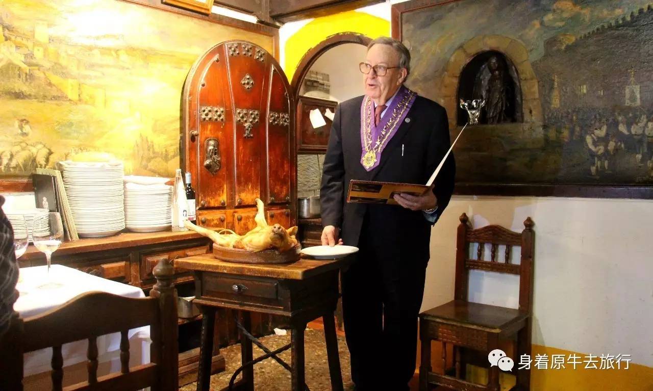 如果哪桌的客人点了一整只烤乳猪呢,挂着奖章的坎迪多老板会叽里咕噜的念一些话,其中祝客人们好胃口我是听懂了哈哈!随后用手中的盘子把乳猪切开,完成切割后老爷爷会把盘子抛出,盘子落地摔碎代表着乳猪的货真价实。