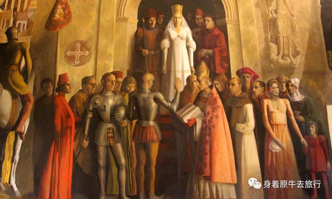 城堡内的巨型壁画描绘了在塞戈维亚的马约尔广场上,宣布伊莎贝拉就任卡斯蒂利亚女王的场景,就是这位伊莎贝拉一世(Isabel I)与阿拉贡的费尔南多二世(Fernando II)国王联姻,称为“天主教双王”,使卡斯蒂利亚和阿拉贡合并形成了现代意义上的西班牙,这对天主教双王在1492年征服了穆斯林摩尔人在伊比利亚半岛最后的据点—格拉纳达王国,同时也在这一年天主教双王资助了哥伦布的远航。