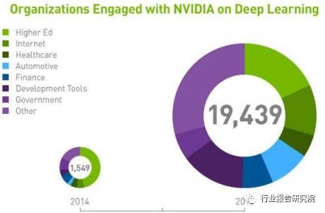 今日的英伟达,已经不再是一家单纯的显卡技术厂商,他现在很赶时髦地称自己为“人工智能计算公司”。据英伟达官网数据显示,2016年,有近两万家机构将英伟达产品用于深度学习加速计算,相比2014年翻了13倍。医疗、生命科学、教育、能源、金融、汽车、制造业以及娱乐业等诸多行业均将得益于海量数据的分析。