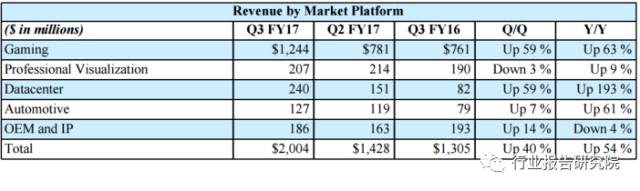 2016年三季度英伟达营收为20.04亿美元,较上年同期的13.05亿美元增长54%;净利润为5.42亿美元,较上年同期的2.46亿美元增长120%,营收的超预期增长推动其盘后股价大幅上涨约16%。以面向的市场平台来划分,游戏业务营收12.4亿美元,同比增长63%,是创造利润的核心部门;数据中心业务营收2.4亿美元,同比增长193%,成为增长最快的部门;自动驾驶业务营收1.27亿美元,同比增长61%,正在逐步打开市场。