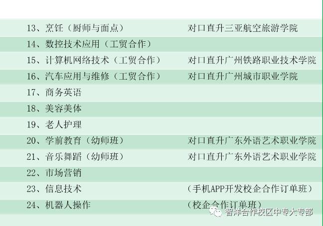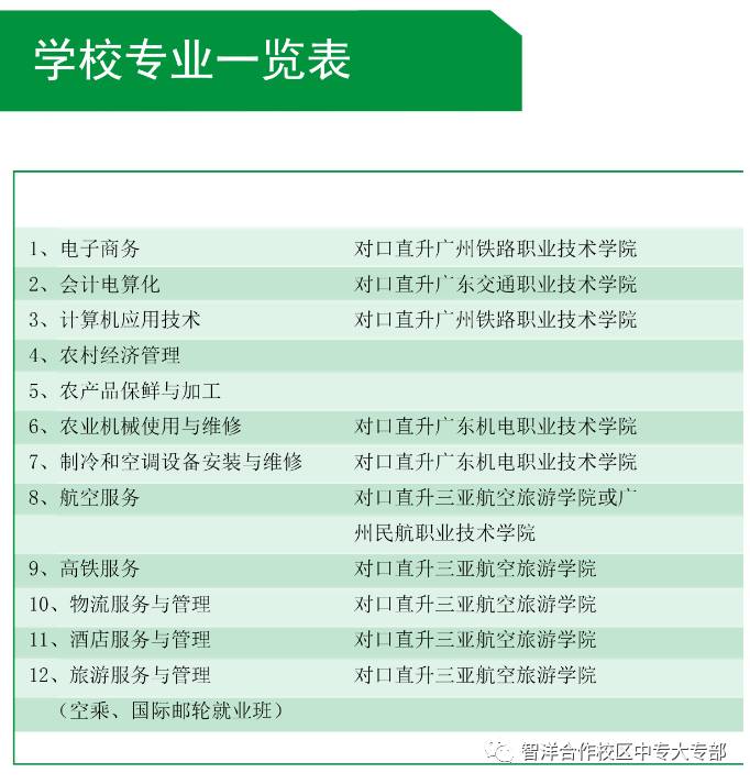 学校还通过联合办学,给有志深造的同学,搭建了中专+直升公办高职大专的绿色通道。前两至三年,在我校读中专课程,后两年到广州民航职业学院、广州铁路职业技术学院、广东机电职业学院、广东交通职业技术学院、广东省外语艺术职业学院、广东职业技术学院等公办3A院校就读普通大专,免高考。