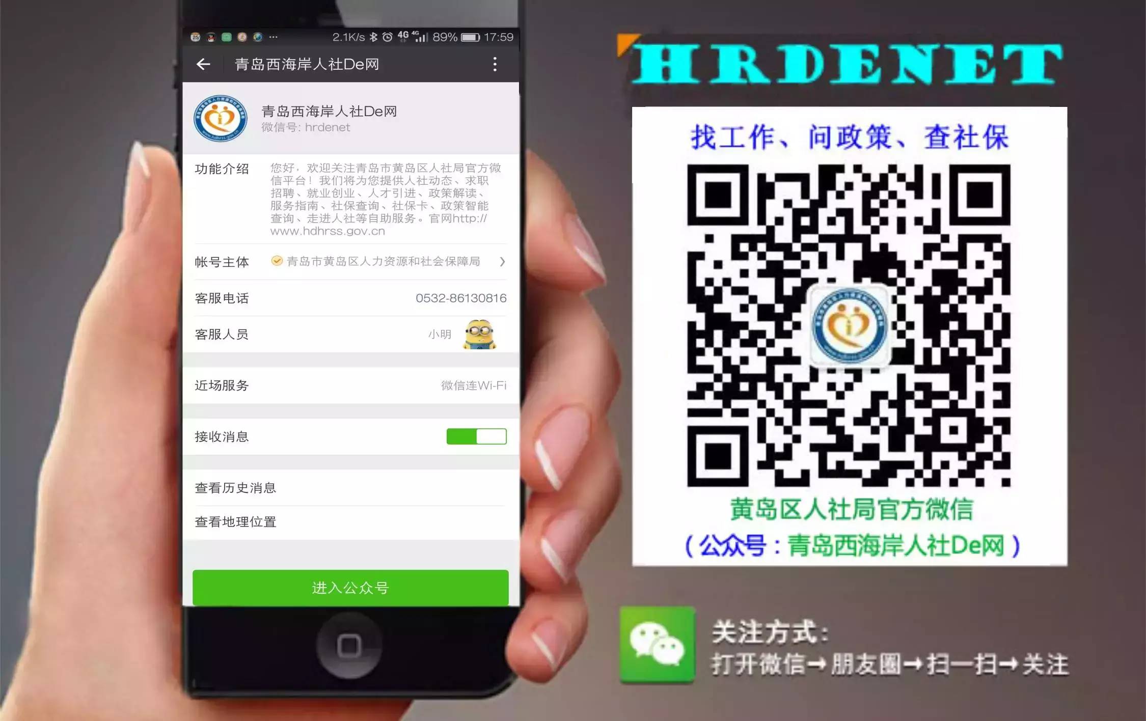 黄岛区人社局名片青岛市黄岛区人力资源和社会保障局人力资源社会保障民生热线电话:12333办公地址:青岛市黄岛区水灵山路59号市民服务中心,邮编266400(东区社保大厅)地址:青岛市经济技术开发区紫金山路36号人力资源和社会保障综合服务中心(西区社保大厅)地址:青岛市黄岛区水灵山路59号1号楼市民服务大厅官方网站:http://www.hdhrss.gov.cn(长按复制链接)电子邮箱:jnhrss@qq.com微信号:hrdenet(公众号:青岛西海岸人社De网)新浪微博:http://weibo.com/jn12333腾讯微博:http://t.qq.com/jnhrss企业行业QQ群地址:http://www.hdhrss.gov.cn/qq/qq.html黄岛区人力资源社会保障【业务咨询电话】地址:http://www.hdhrss.gov.cn/zwgk/ywzxdh/2015-03-11/165.html