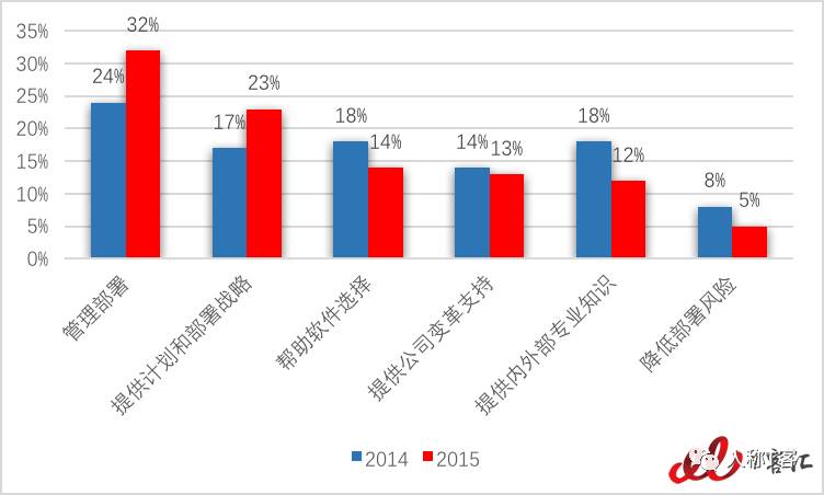 虽然公司在计划和部署方面的顾问有所增加,但是整体顾问数量,尤其帮助软件选择方面的顾问数量有所减少。这也进一步解释了为什么在技术和运营问题上的问题会有所增加。放弃顾问而选择DIY的方式往往容易忽略一些本应该在软件选择前做得考量,比如:公司变革和业务流程管理。