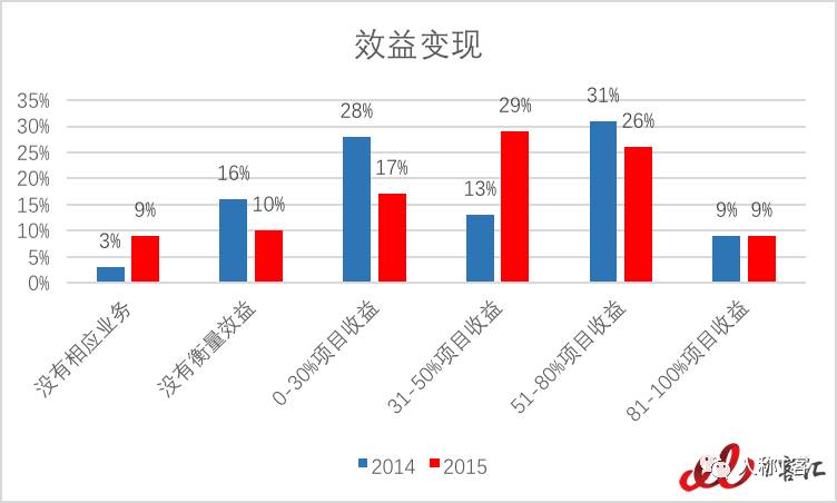 相比去年,实现高效益的公司比例下降,但实现较低效益的公司比例上升了,其中还新增了6%表示没有开展此项业务的公司。