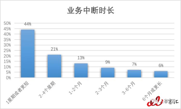 虽然许多公司表示遇到了业务中断情况,但是其中44%的表示中断时长在1周或者更短,比去年增长了14%。整体上,表示业务中断时间较短的公司有所增加,较长的公司有所减少。