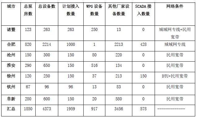 2017年度计划对诸暨、合肥、沧州、淮安、徐州、钦州、阜新七个城市水司管理的约1000泵房,近2000套二次供水设备进行新产品接入或老旧设备改造,如表1所示。