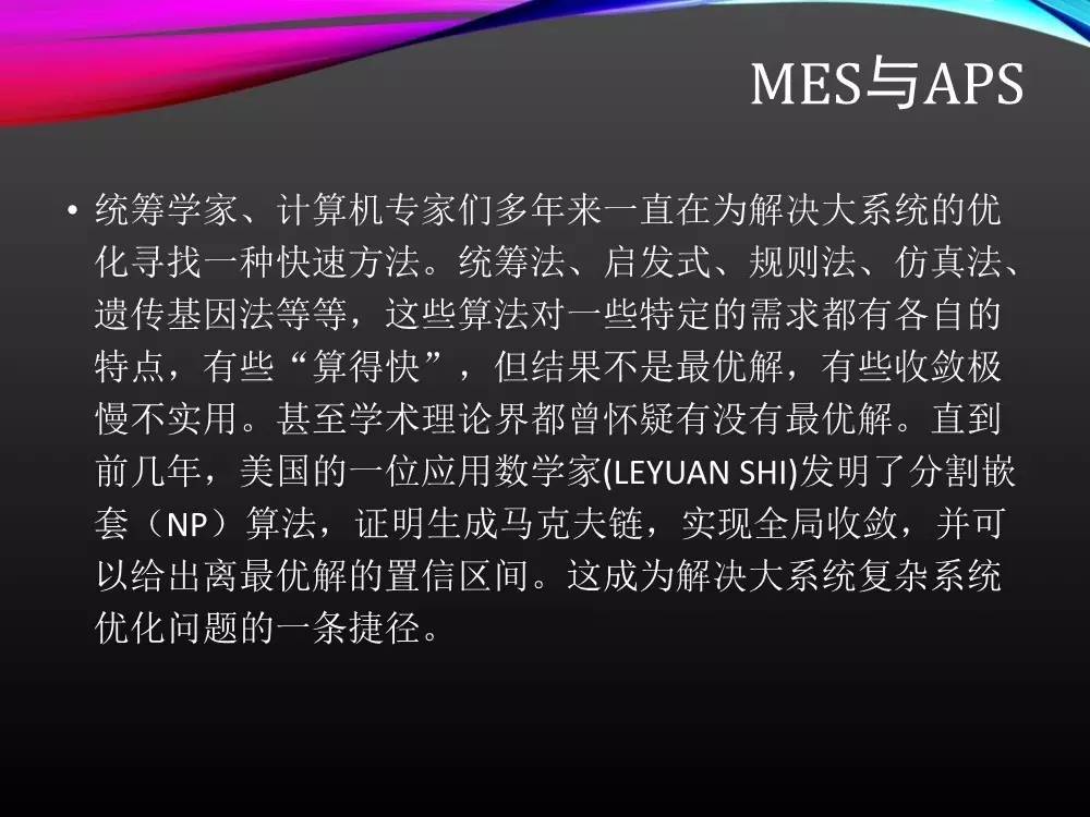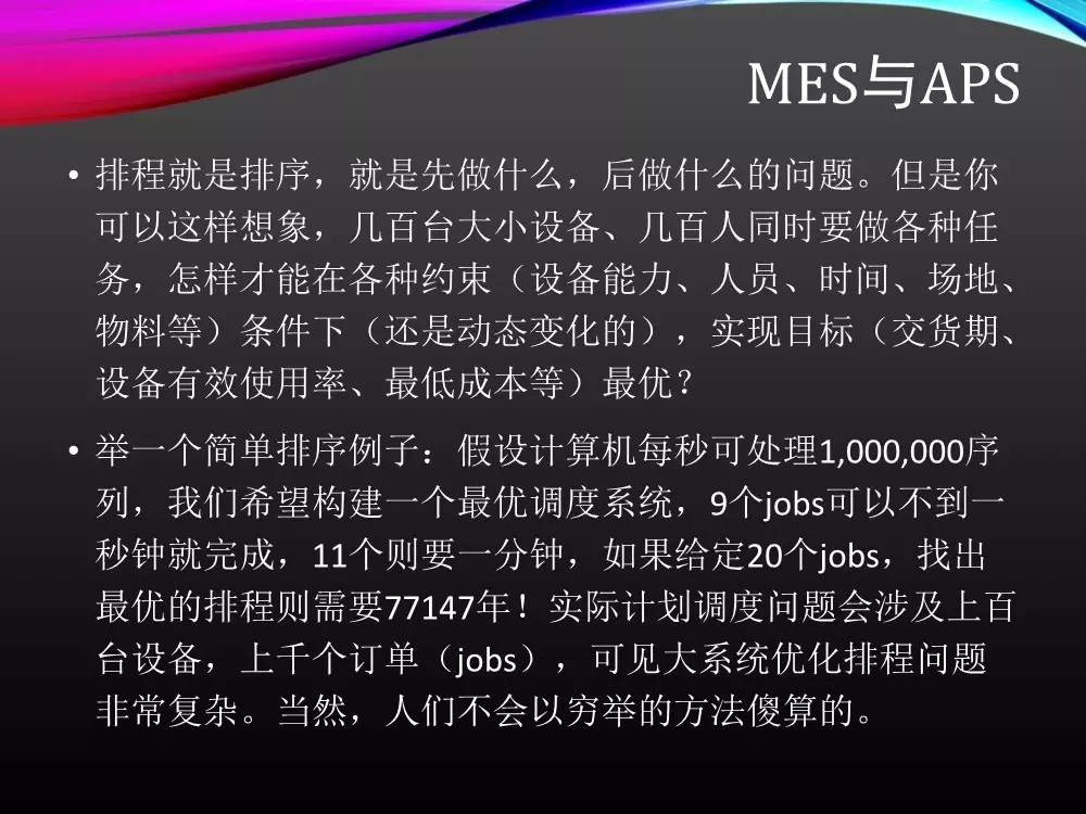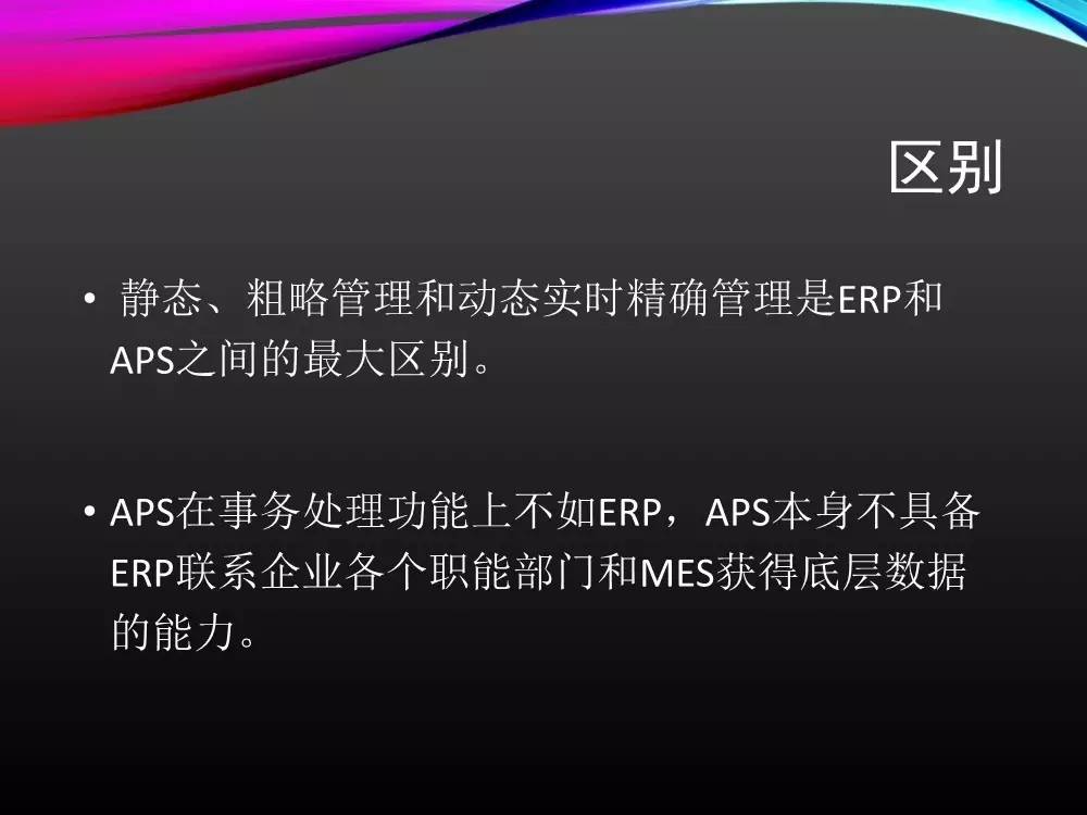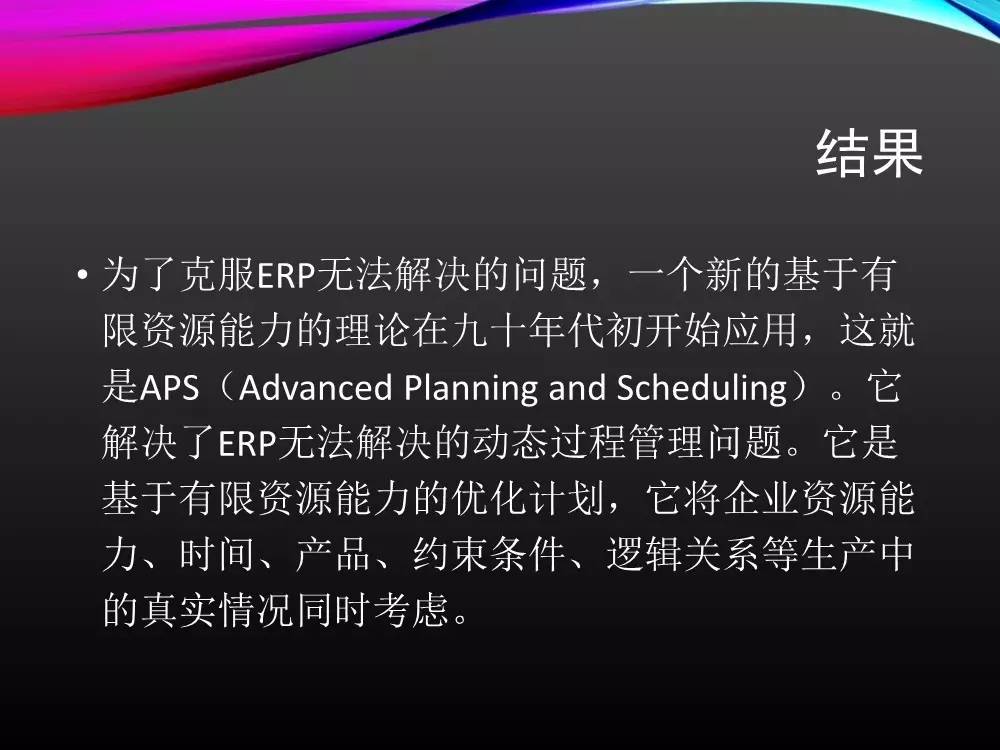 ERP中的生产部分一般由如下几大模块构成:MPS(主生产计划)、MRP (物料需求计划)、MOM(生产订单管理)、SFC(车间现场管理)。由于ERP是基于无限产能,并且是以订单向后“推出”的计划,所以无法给出生产详细计划准确交期详细的排产安排以及物料需。