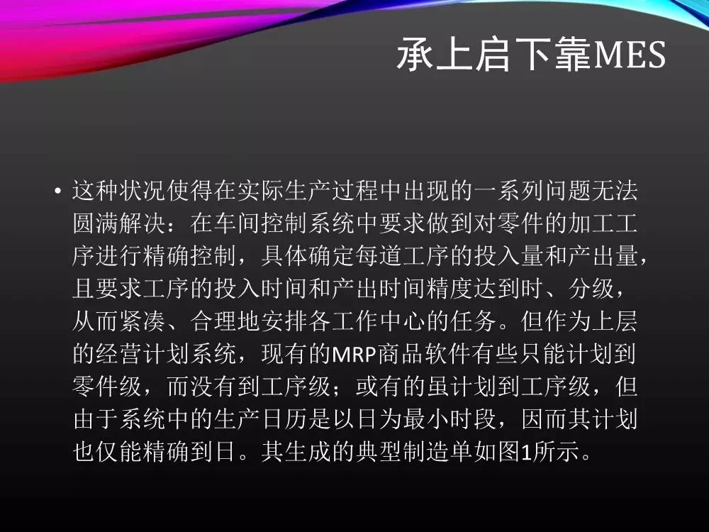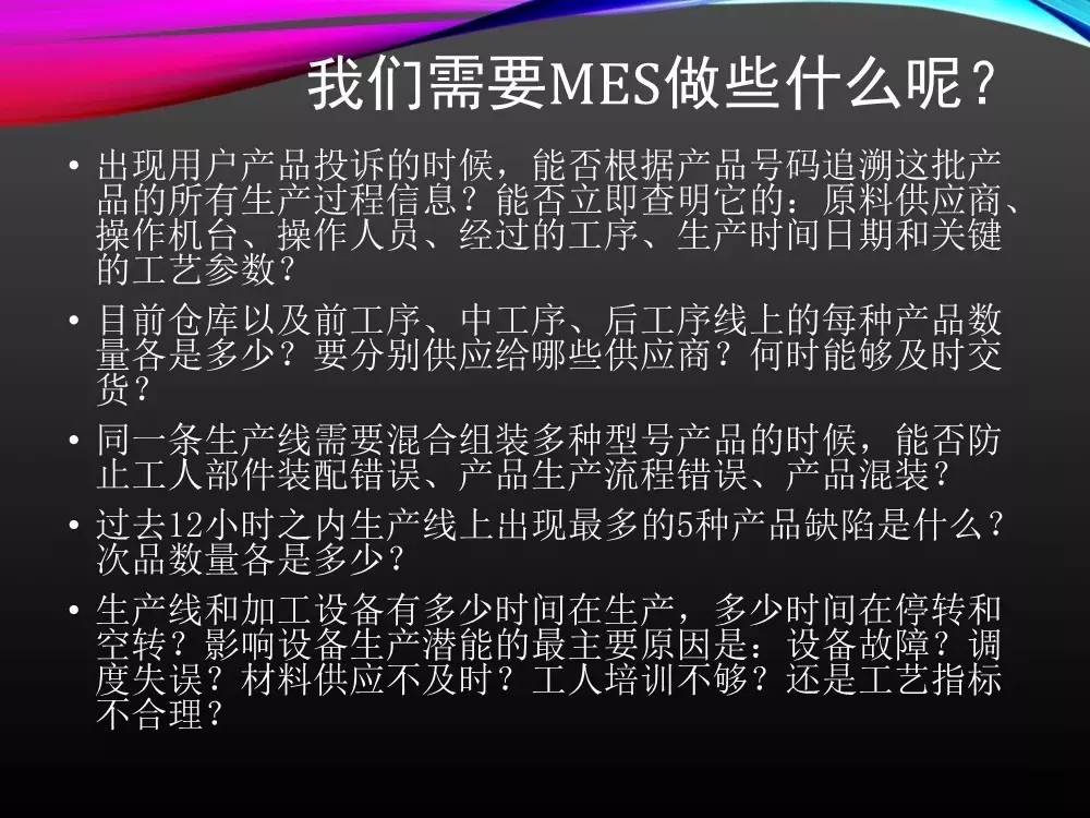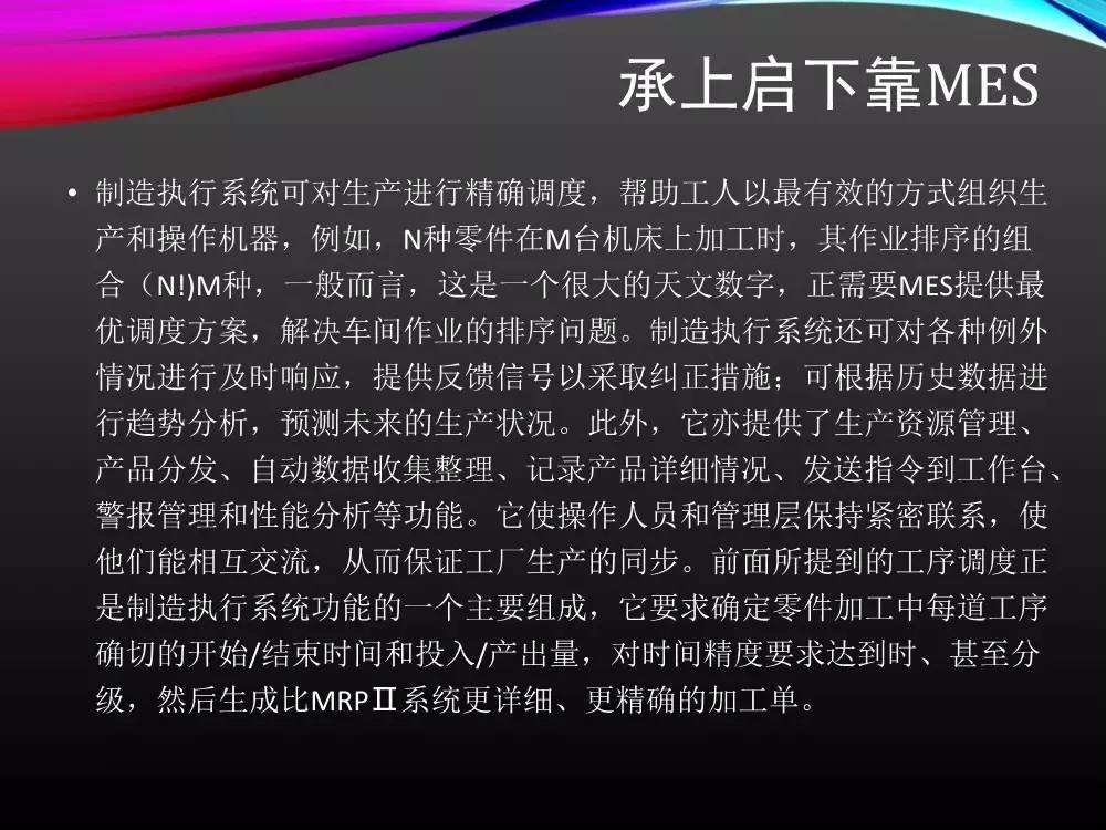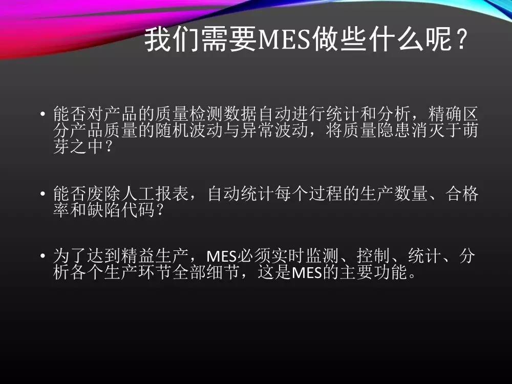 ERP生产管理模块(MPS、MRP、MOM、SFC)提供的就是一个非常粗略的计划与生产过程数据采集统计功能,无法满足用户实际的生产流程控制。必须一个计划层和控制层之间的执行环节。于是,生产管理的任务当然地由MES(制造执行系统)来完成了。