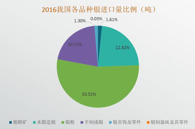 图一:2016年我国各品种银进口量比例(单位:吨)