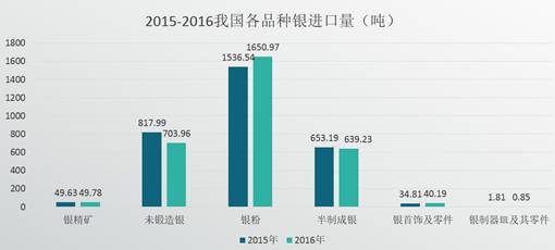 图二:2015-2016年我国各品种银进口量(单位:吨)