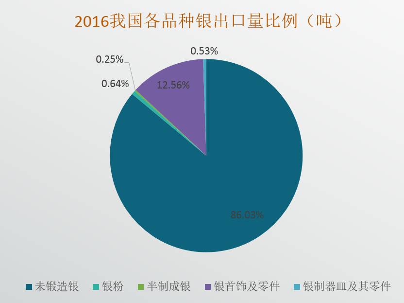 图三:2016年我国各品种银出口量比例(单位:吨)