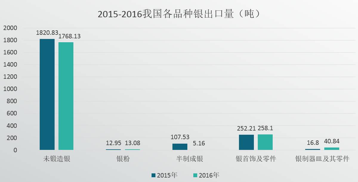 图四:2015-2016年我国各品种银出口量(单位:吨)