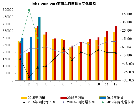 1-3月,商用车产销累计分别完成102.6万辆和105.4万辆,同比分别增长15.4%和22.9%。分车型产销情况看,客车产销同比分别下降22.5%和21.1%;货车产销同比分别增长了21.4%和30.1%,货车产销量继续较快增长。