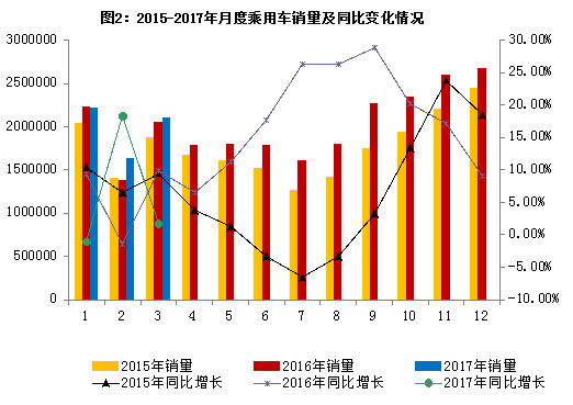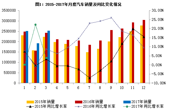 2017年3月,汽车产销环比呈较快增长。1-3月,汽车产销保持稳定增长,产销增幅比上年同期均呈小幅提升。