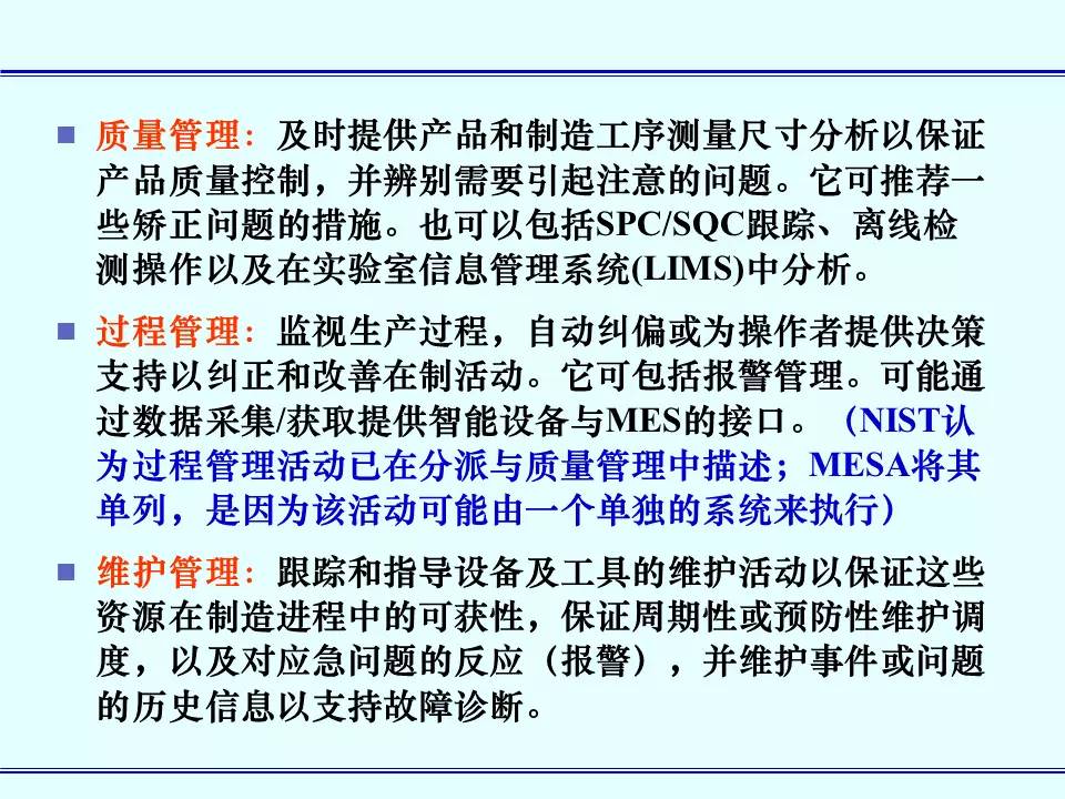 MES能通过信息传递对从订单下达到产品完成的整个生产过程进行优化管理。当工厂发生实时事件时,MES能对此及时做出反应、报告,并用当前的准确数据对它们进行指导和处理。
